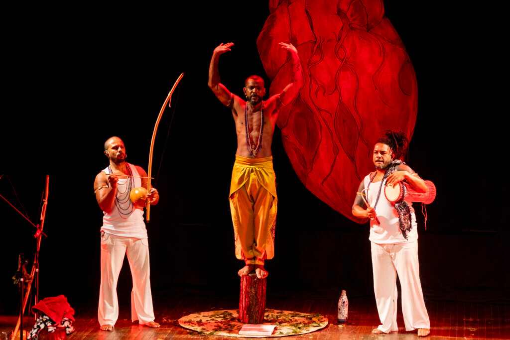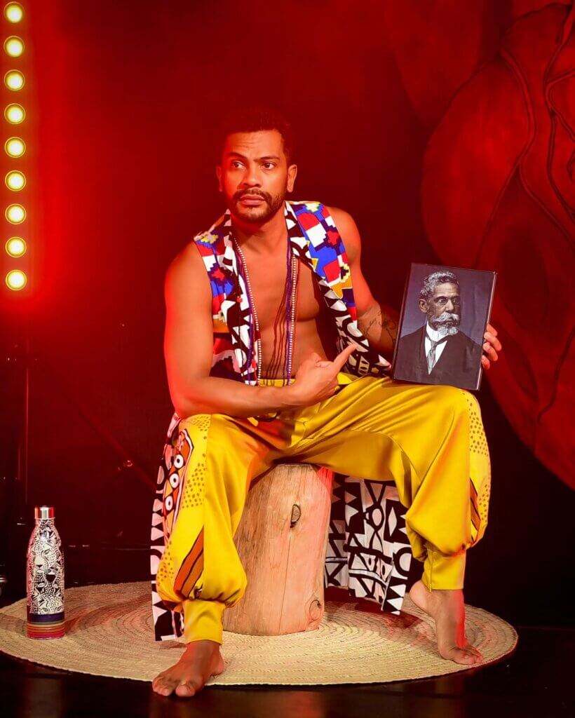 O público acompanha o relato que traz um apanhado histórico do Brasil, expondo a versão visceral de um país fundado em pilares racistas e inquisidores. O texto ainda é acompanhado por uma reflexão sobre Machado de Assis, um dos maiores autores negros brasileiros, que foi “embranquecido” pela história oficial.